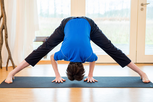 Benefits: Wide-legged ahead bend stretches the hamstrings, internal thighs, and spine, and calms the thoughts.